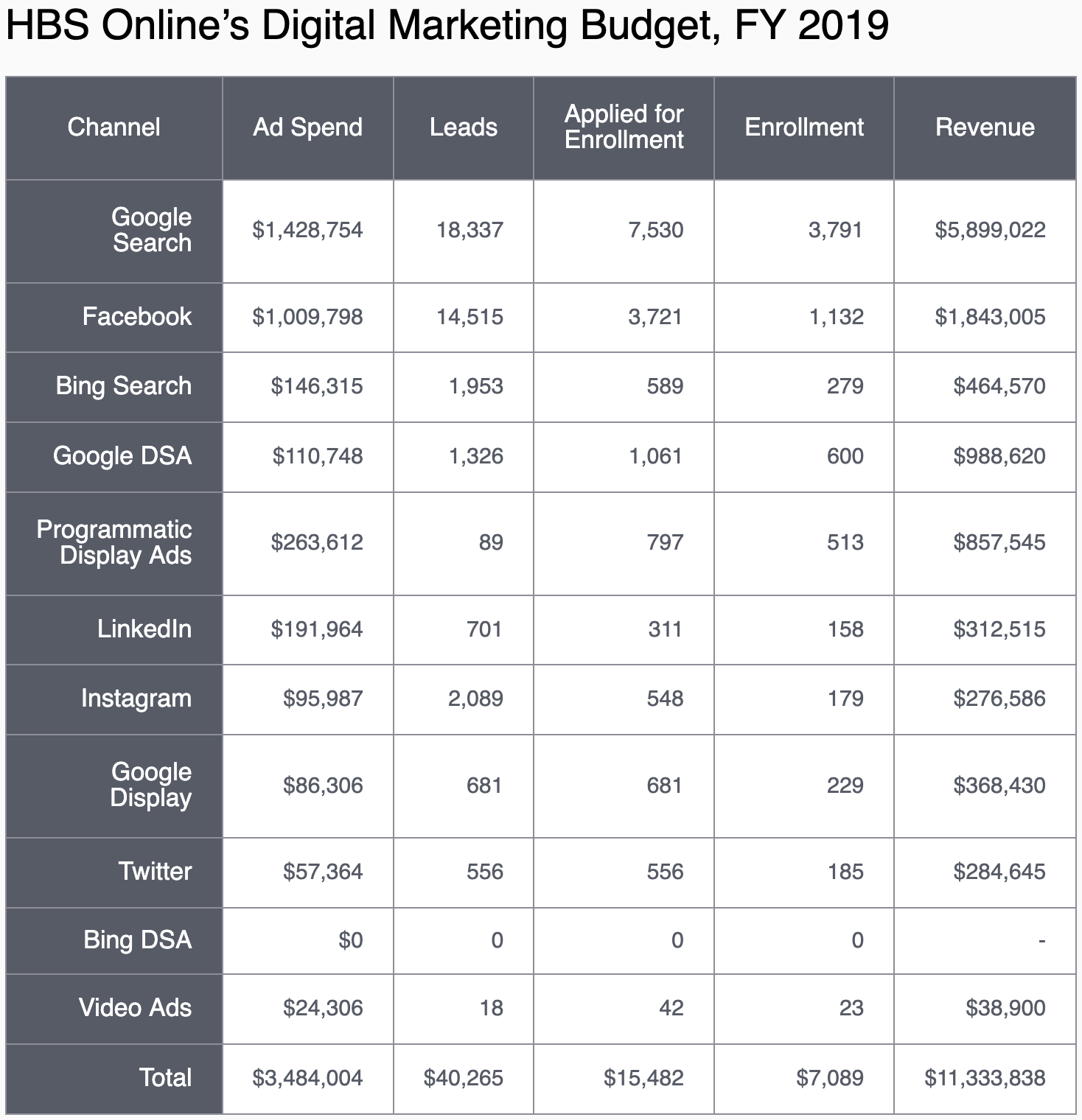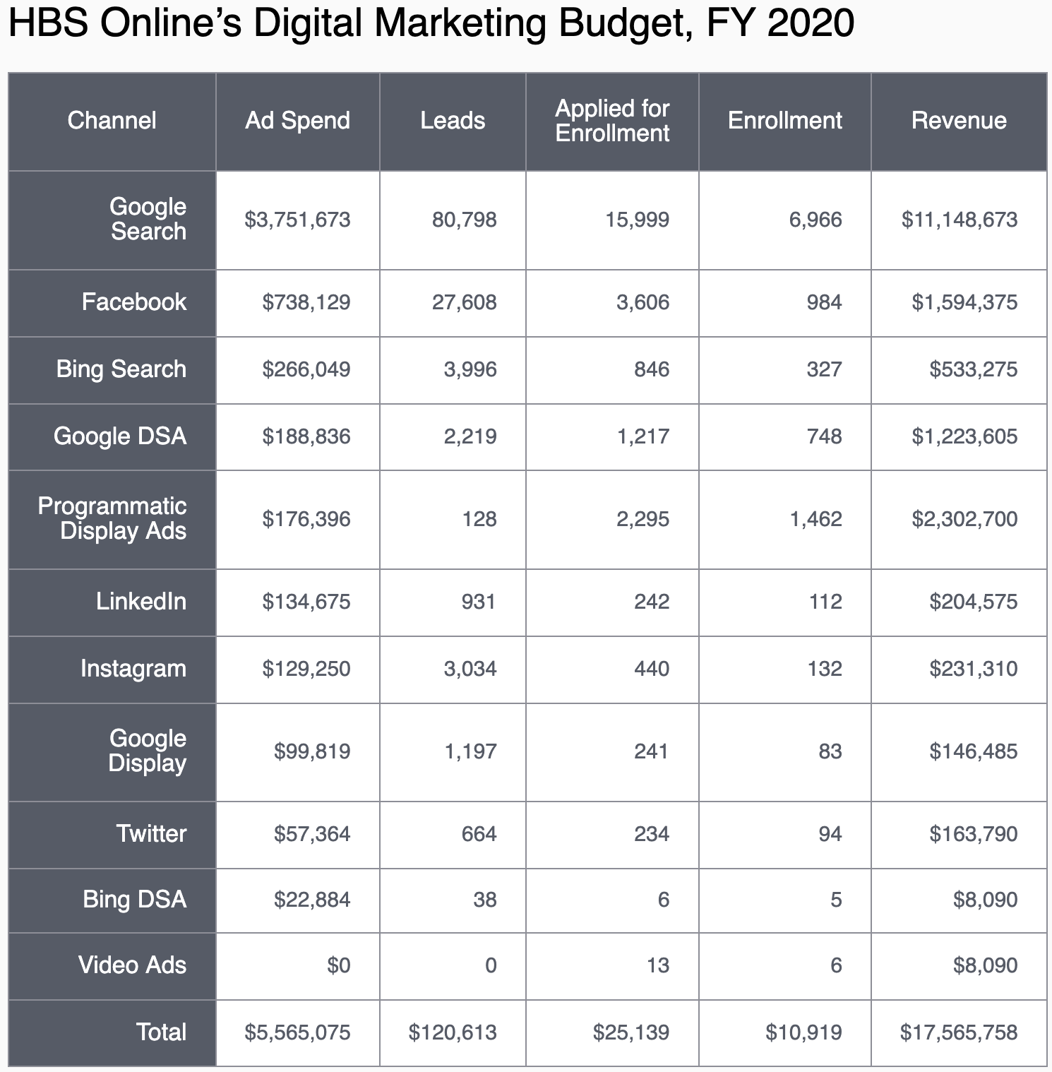 Take a moment to examine the chart below, which lays out HBS Online’s digital ad spend by channel.