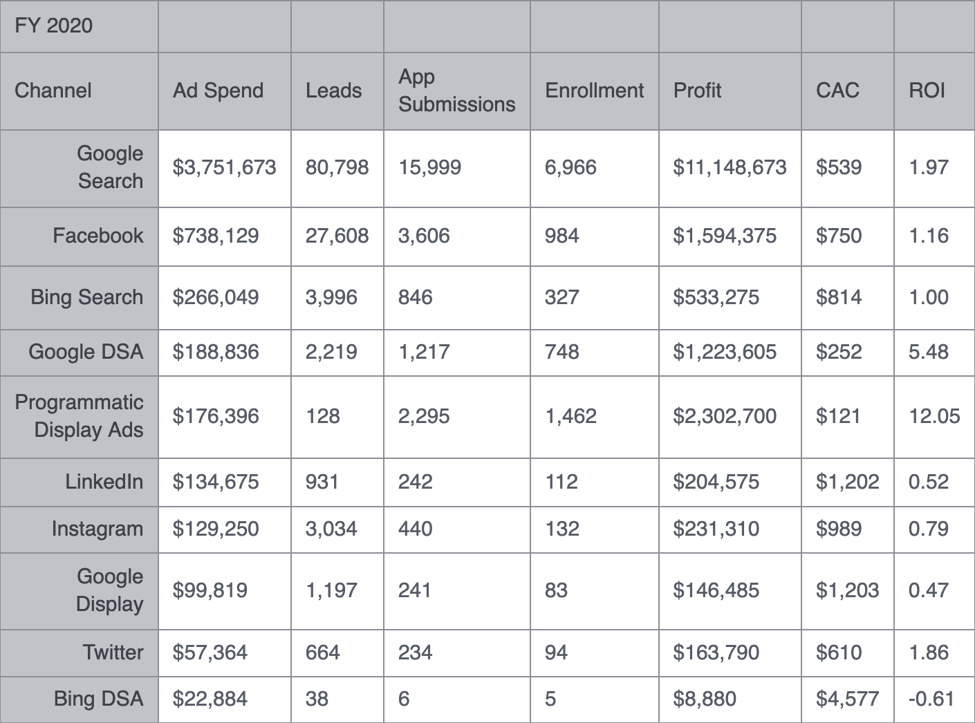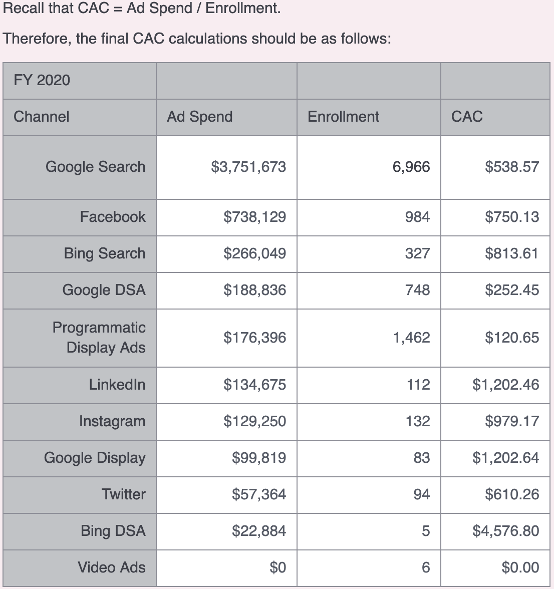In other words, we should combine CAC with the profit generated through that channel to get the full picture of its return on investment. So even though Programmatic Display Ads and Google DSA are affordable channels for acquiring new customers, we need to combine their CAC with how much money it is bringing in to HBS Online to get a complete picture.