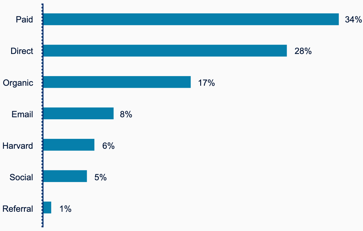 This graph describes the sources of traffic to HBS Online’s website in 2020. Notice that only 34% of the traffic came from paid media sources. As we’ve encountered previously, branded advertising has the highest ROI, likely due to the strong role that HBS Online’s association with the Harvard name plays in generating traffic and enrollments.