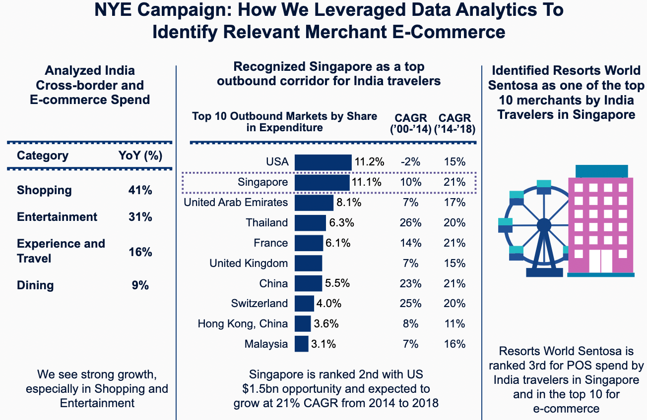 Macro analysis focuses on identifying broad trends in the marketplace. For example, during the Hugh Jackman campaign, Mastercard observed significant growth in shopping and entertainment activities among its consumers in India. Additionally, it discovered that the U.S. and Singapore were the most desirable travel destinations for Indian consumers. Within Singapore, Resorts World Sentosa emerged as one of the top ten preferred destinations for Indian travelers.