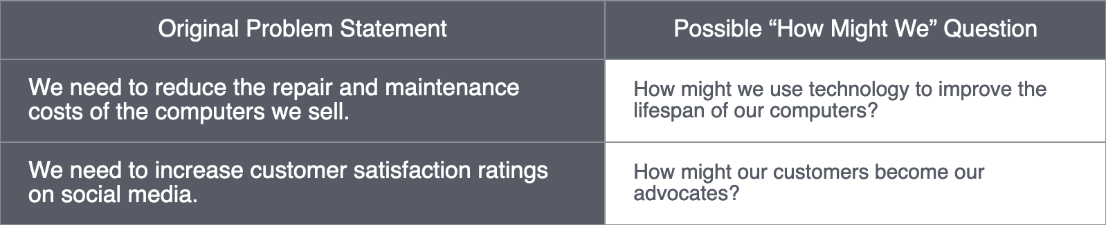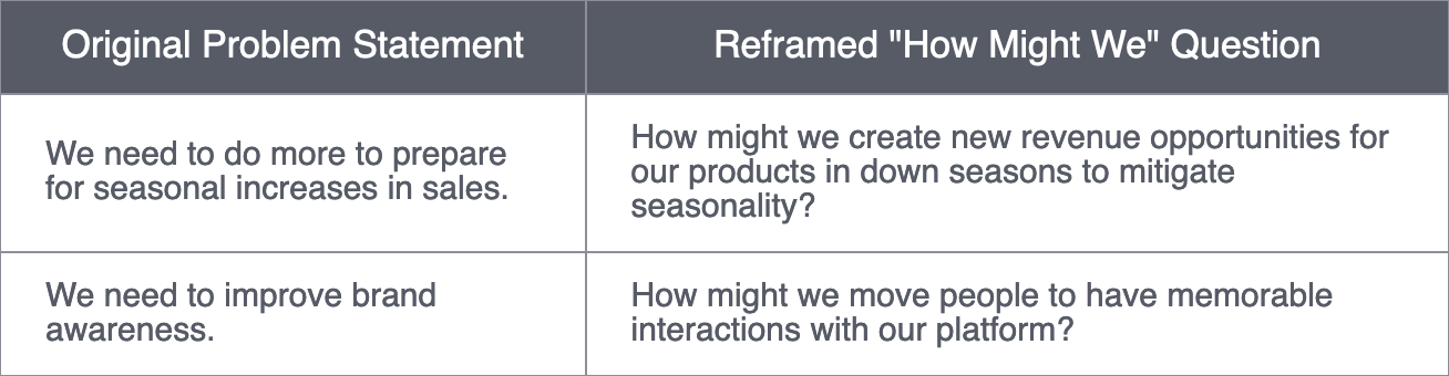 For an everyday example, imagine that a child is constantly late for school. The initial problem is, "We need her to get to school on time." But we could reframe it as, "How might we ensure everyone wakes up early?" This shifts the focus to additional people, time frames, and activities. The goal is to encourage discussion from a different perspective.