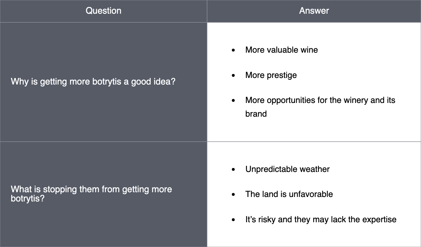But we are approaching this problem from an innovation context. From that perspective, the framing did not address the most interesting part of the problem - the botrytis. Botrytis was the most game-changing part of the problem. And none of the solutions generated by focusing on the value of one harvest would have addressed how to get botrytis more often.