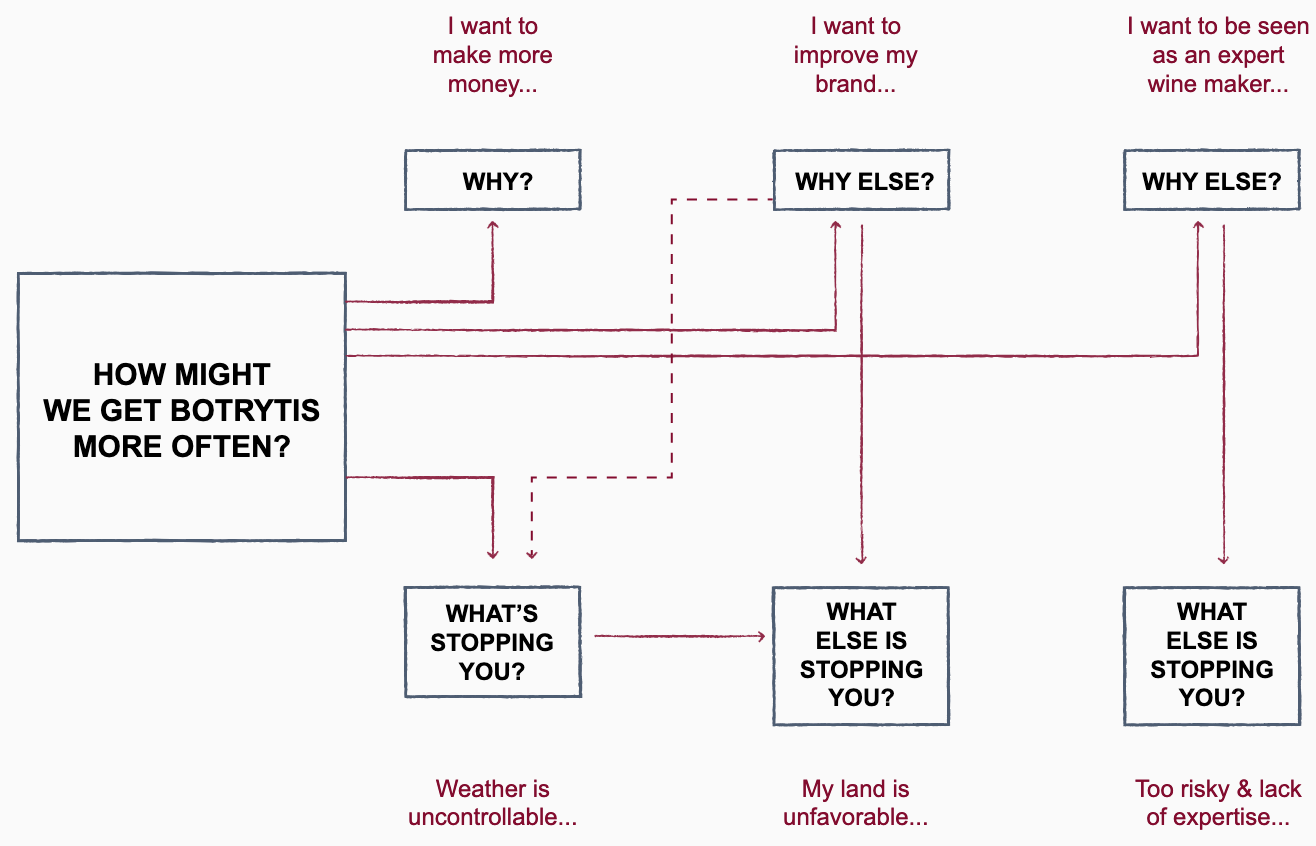 The following is a template for how the Botrytis question might be explored. As you answer “why” and “what is stopping you,” you can explore connections and different starting points for forming a “how might we” question: