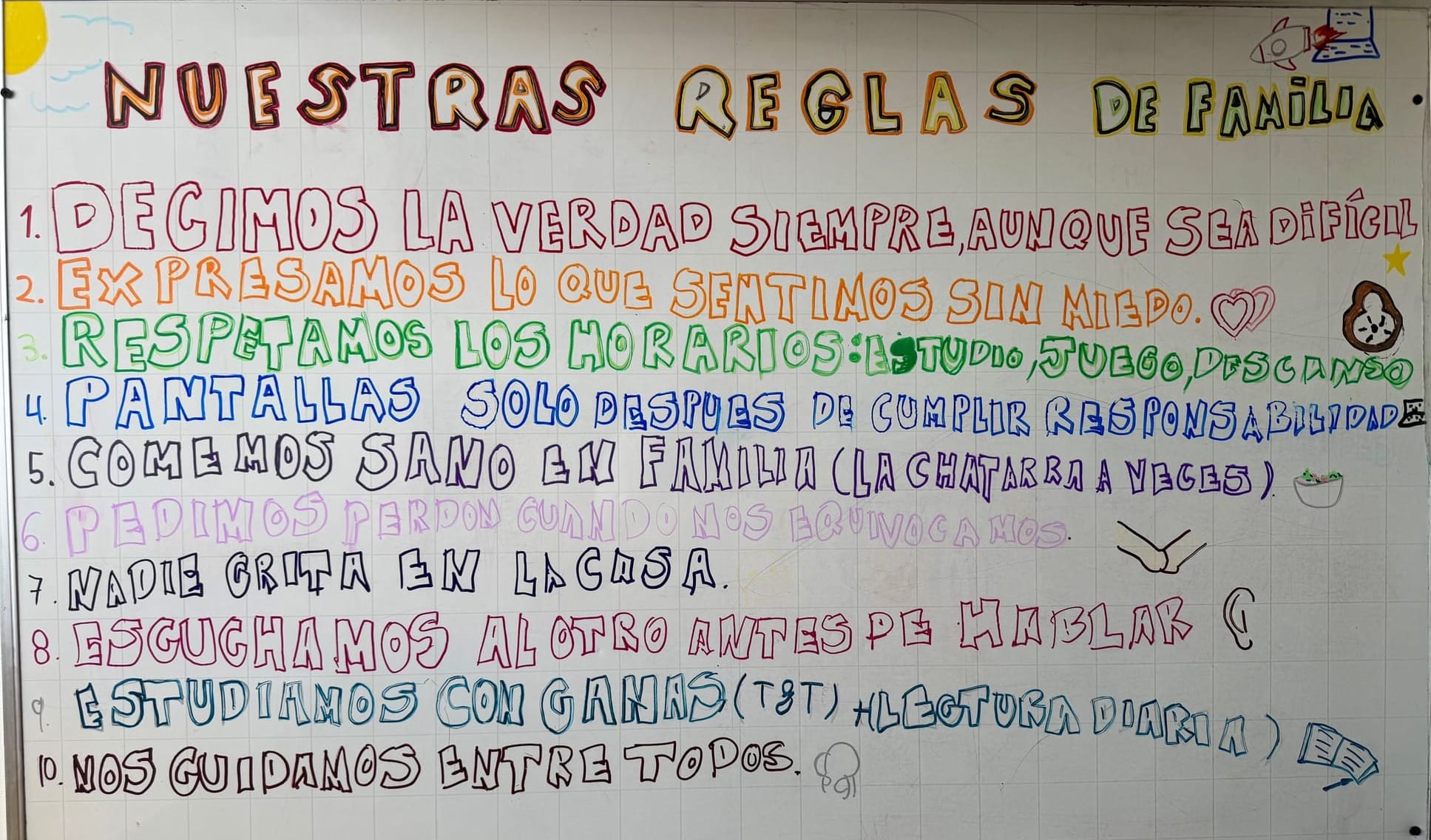 Miranda tomó los marcadores y con su letra —a veces grande, a veces apretada, siempre con personalidad— fue poniendo cada regla. Maxi dibujaba al lado: un corazón aquí, una orejita allá, un cohete en la esquina. Así son ellos: ella escribe, él ilustra.