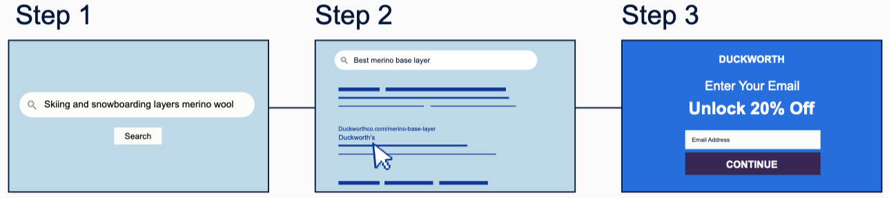 One of the first things that the marketing team created with Tadpull was a customer journey map for new customers that it hoped to acquire through owned media. The marketing team believed that consumers were likely to become aware of Duckworth while searching for use cases related to wool clothing. These might include keywords such as "skiing and snowboarding layers merino wool" or "best merino base layer." Organic search results for these and similar keywords might lead to a click that would bring consumers to the Duckworth website, where they would be offered a discount code if they provided their email. A percentage of these visitors would sign up for this email list and enter the consideration phase of the customer journey. Duckworth would then focus on engaging these consumers via email marketing. When a customer finally decides to purchase, they would go to the website, enter a promo code from their email, and checkout.