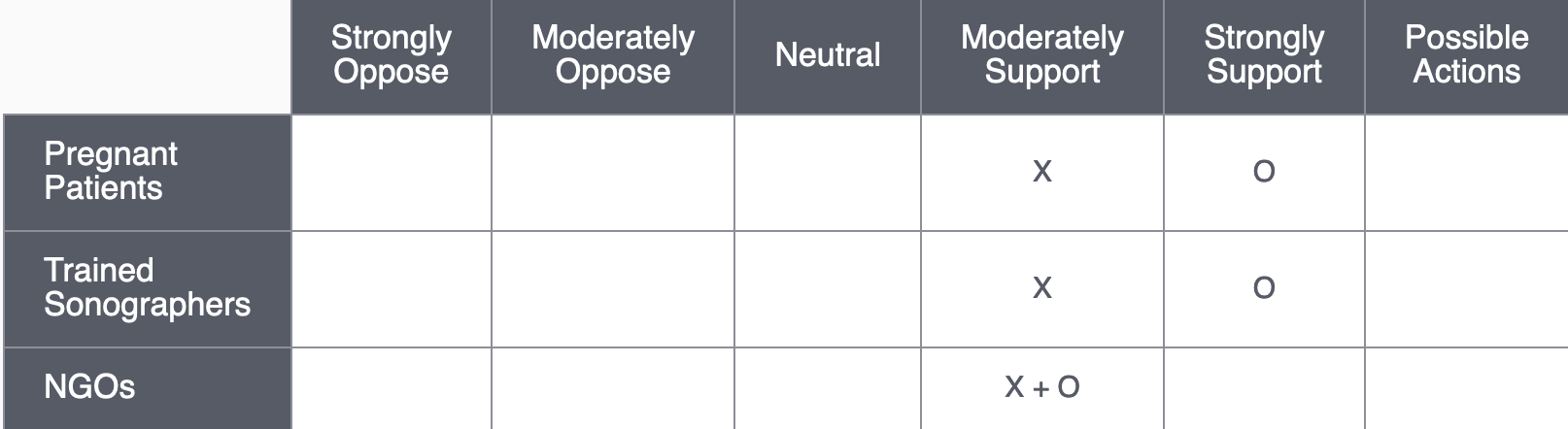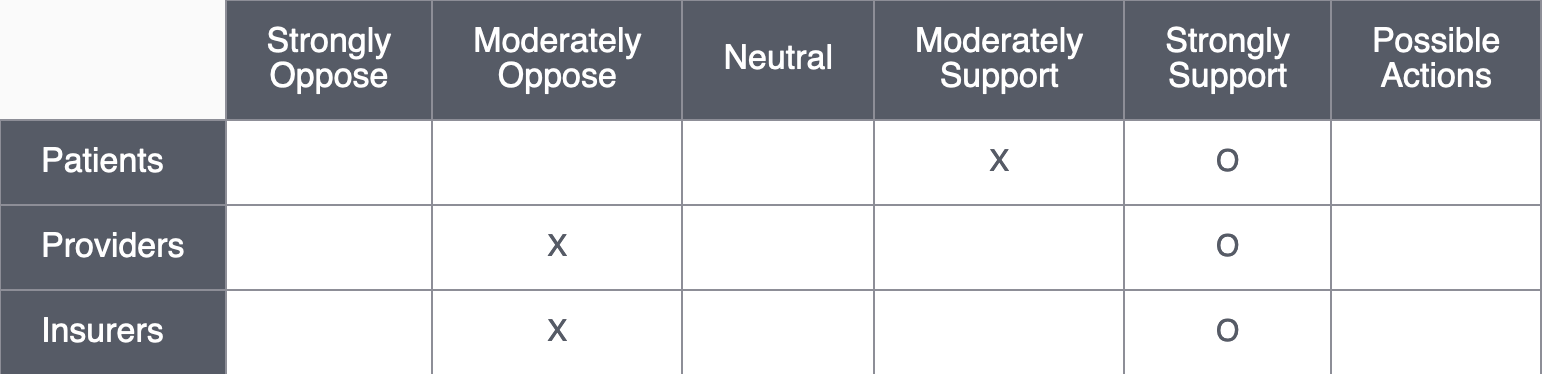 The table that follows is an example showing where patients, providers, and insurers might be in accepting the imaging innovations that Philips presented in the preceding video. Each X indicates where stakeholders currently are. The O’s indicate where the designers need them to be.