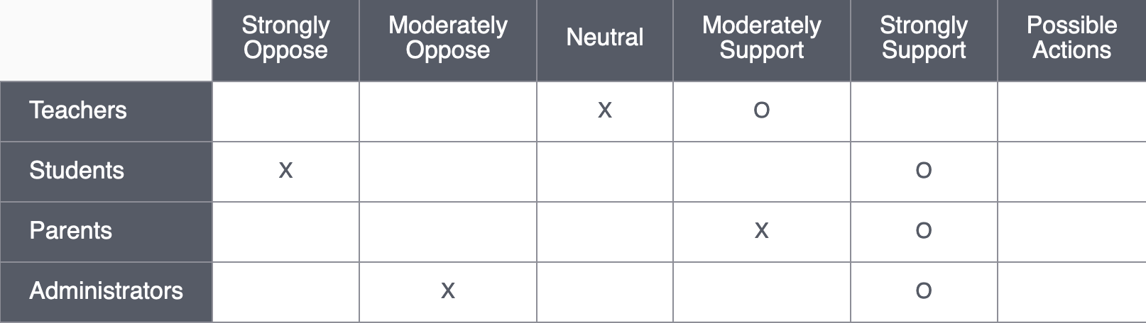 In this case, the rankings assume that teachers would be indifferent, students would strongly oppose the removal of foods they like, parents would be glad their children have more nutritious options, and administrators would be concerned about the logistics of implementation. But you should base these estimates on research whenever possible. For example, teachers in some schools might have strong opinions based on their lunch-related duties or experience with children’s health and energy levels.