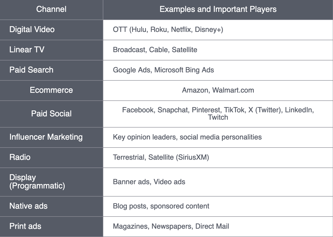 Here is just a small sample of the many paid media channels that marketers make use of, with some examples and important players.