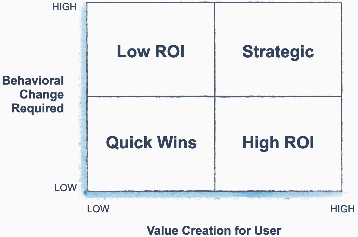 - High ROI (Many perceived benefits, little behavior change required): As with Quick Wins, little behavior change is required, so you can focus on the innovation’s exceptional functional and emotional benefits.